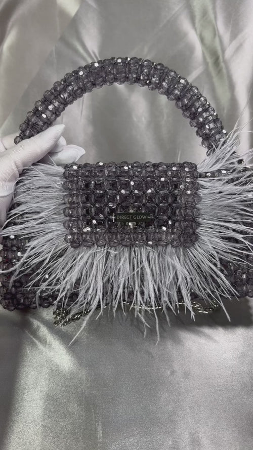 The Galaxy bag is a striking accessory that combines elegance and versatility. Handcrafted from faceted acrylic or glass beads, it’s adorned with luxurious ostrich feathers that can be easily removed — instantly transforming the bag from a statement piece into a timeless classic!